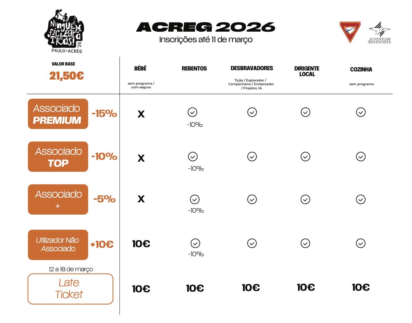 Consulta aqui a matriz relativa às várias modalidades de inscrição e respetivos valores. Após dia 11 de março, entre 12 e 18 de março, as inscrições terão um agravamento de preço. Evita o Late Ticket e inscreve-te já.